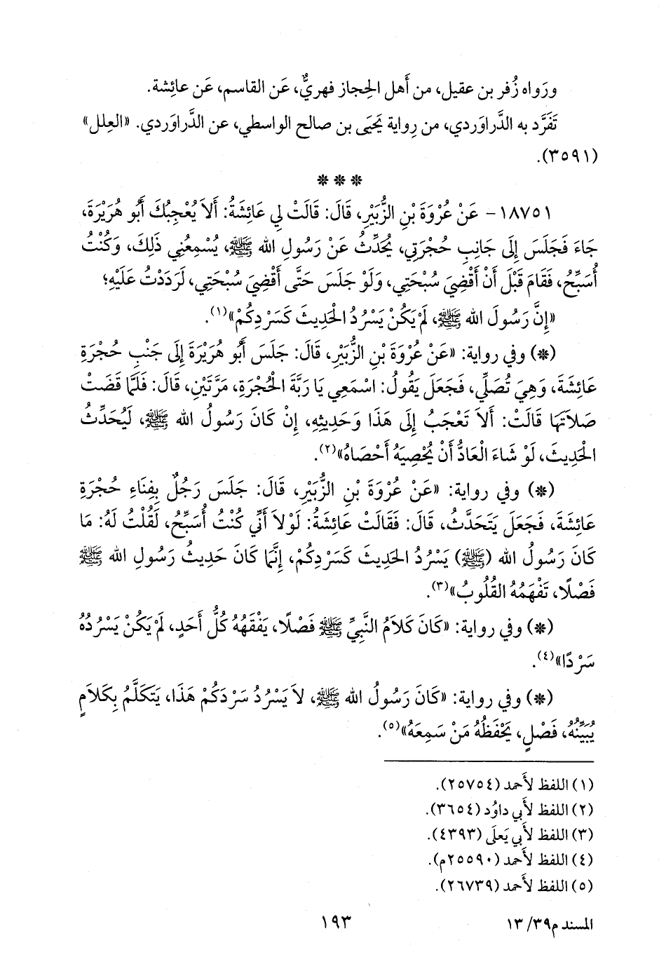 - وفي رواية: «عن عروة بن الزبير، قال: جلس رجل بفناء حجرة عائشة، فجعل يتحدث، قال: فقالت عائشة: لولا أني كنت أسبح، لقلت له: ما كان رسول الله (صَلى الله عَليه وسَلم) يسرد الحديث كسردكم، إنما كان حديث رسول الله صَلى الله عَليه وسَلم فصلا، تفهمه القلوب» (¬٣).