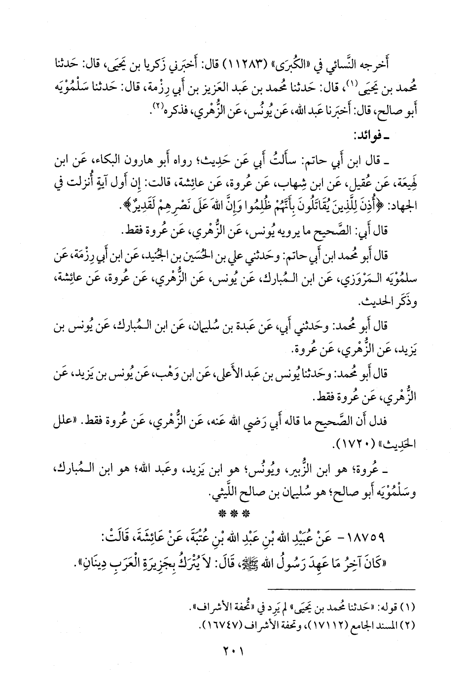 قال أَبو محمد: وحدثني أبي، عن عَبدة بن سليمان، عن ابن المبارك، عن يونس بن يزيد، عن الزُّهْري، عن عروة.