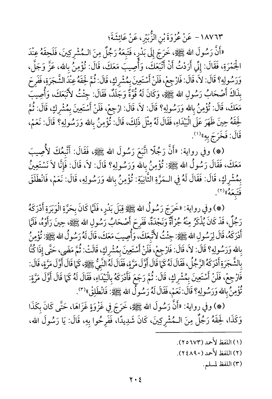 - وفي رواية: «خرج رسول الله صَلى الله عَليه وسَلم قبل بدر، فلما كان بحرة الوبرة أدركه رجل، قد كان يذكر منه جرأة ونجدة، ففرح أصحاب رسول الله صَلى الله عَليه وسَلم حين رأوه، فلما أدركه، قال لرسول الله صَلى الله عَليه وسَلم: جئت لأتبعك، وأصيب معك، قال له رسول الله صَلى الله عَليه وسَلم: تؤمن بالله ورسوله؟ قال: لا، قال: فارجع، فلن أستعين بمشرك، قالت: ثم مضى، حتى إذا كنا بالشجرة أدركه الرجل، فقال له كما قال أول مرة، فقال له النبي صَلى الله عَليه وسَلم كما قال أول مرة، قال: فارجع، فلن أستعين بمشرك، قال: ثم رجع فأدركه بالبيداء، فقال له كما قال أول مرة: تؤمن بالله ورسوله؟ قال: نعم، فقال له رسول الله صَلى الله عَليه وسَلم: فانطلق» (¬٣).