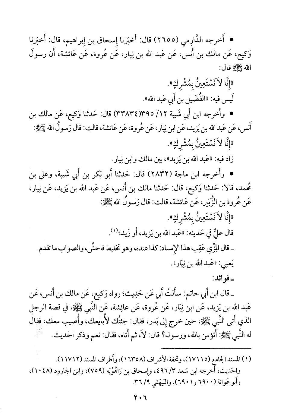 - قال ابن أَبي حاتم: سأَلتُ أَبي عن حديث؛ رواه وكيع، عن مالك بن أَنس، عن عبد الله بن يزيد، عن ابن نيار، عن عُروة، عن عائشة، عن النبي صَلى الله عَليه وسَلم في قصة الرجل الذي أَتى النبي صَلى الله عَليه وسَلم حين خرج إِلى بدر، فقال: جئتُك لأُبايعك وأُصيب معك، فقال له النبي صَلى الله عَليه وسَلم: أَتؤمن بالله، ورسوله؟ قال: لا، ثم أَتاه، فقال: نعم، وذكر الحديث.