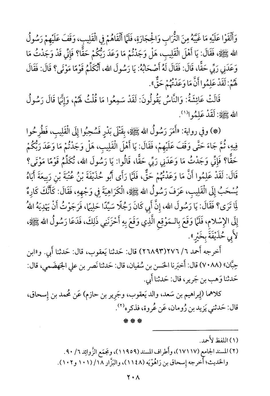 - وفي رواية: «أمر رسول الله صَلى الله عَليه وسَلم بقتلى بدر فسحبوا إلى القليب، فطرحوا فيه، ثم جاء حتى وقف عليهم، فقال: يا أهل القليب، هل وجدتم ما وعد ربكم حقا؟ فإني وجدت ما وعدني ربي حقا، قالوا: يا رسول الله، تكلم قوما موتى؟ قال: لقد علموا أن ما وعدتهم حق، فلما رأى أَبو حذيفة بن عُتبة بن ربيعة أباه يسحب إلى القليب، عرف رسول الله صَلى الله عَليه وسَلم الكراهية في وجهه، فقال: كأنك كاره لما ترى؟ فقال: يا رسول الله، إن أبي كان رجلا سيدا حليما، فرجوت أن يهديه الله إلى الإسلام، فلما وقع بالموقع الذي وقع به أحزنني ذلك، فدعا رسول الله صَلى الله عَليه وسَلم لأبي حذيفة بخير».