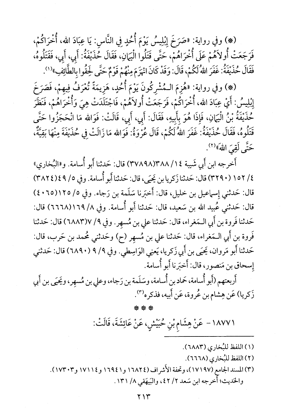 - وفي رواية: «هزم المشركون يوم أحد، هزيمة تعرف فيهم، فصرخ إبليس: أي عباد الله، أخراكم، فرجعت أولاهم، فاجتلدت هي وأخراهم، فنظر حذيفة بن اليمان، فإذا هو بأبيه، فقال: أبي، أبي، قالت: فوالله ما انحجزوا حتى قتلوه، فقال حذيفة: غفر الله لكم، قال عروة: فوالله ما زالت في حذيفة منها بقية، حتى لقي الله» (¬١).