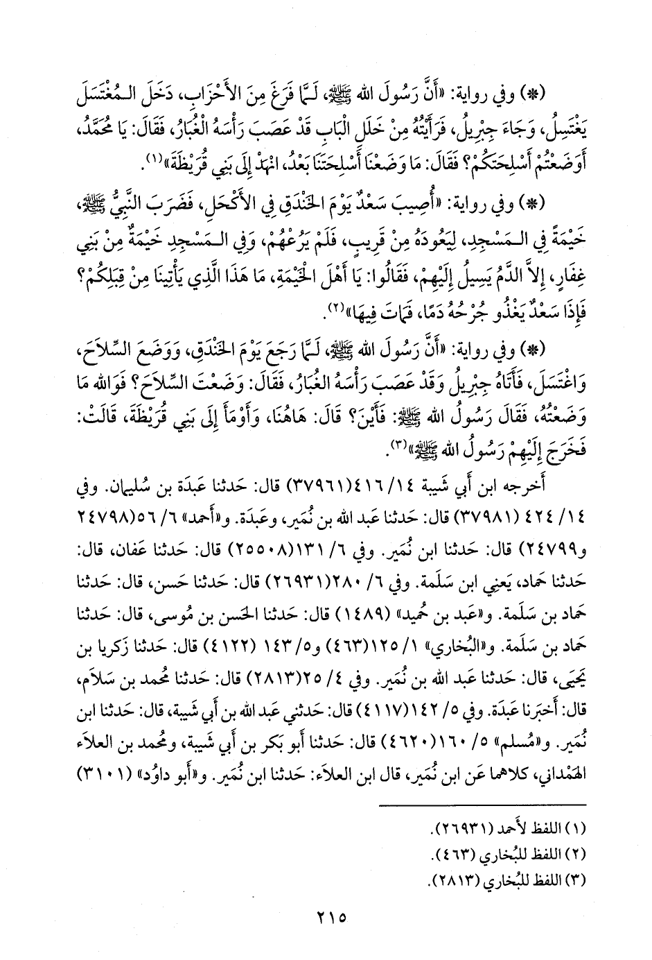 - وفي رواية: «أن رسول الله صَلى الله عَليه وسَلم لما رجع يوم الخندق، ووضع السلاح، واغتسل، فأتاه جبريل وقد عصب رأسه الغبار، فقال: وضعت السلاح؟ فوالله ما وضعته، فقال رسول الله صَلى الله عَليه وسَلم: فأين؟ قال: هاهنا، وأومأ إلى بني قريظة، قالت: فخرج إليهم رسول الله صَلى الله عَليه وسَلم» (¬٢).