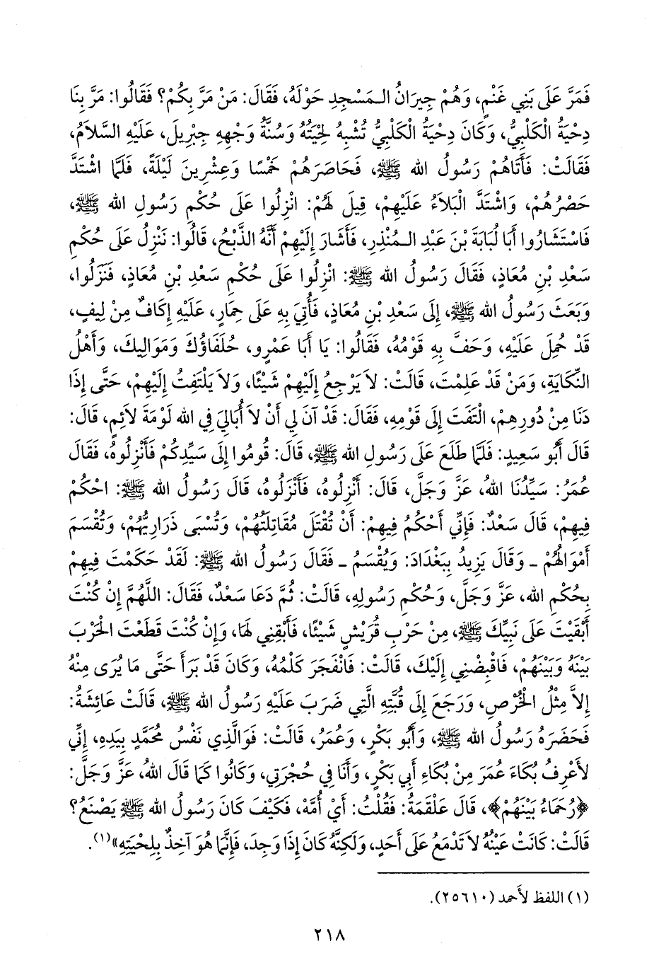 فقالوا: يا أبا عَمرو، حلفاؤك ومواليك، وأهل النكاية، ومن قد علمت، قالت: لا يرجع إليهم شيئا، ولا يلتفت إليهم، حتى إذا دنا من دورهم، التفت إلى قومه، فقال: قد آن لي أن لا أبالي في الله لومة لائم، قال: قال أَبو سعيد: فلما طلع على رسول الله صَلى الله عَليه وسَلم قال: قوموا إلى سيدكم فأنزلوه، فقال عمر: سيدنا الله، عز وجل، قال: أنزلوه، فأنزلوه، قال رسول الله صَلى الله عَليه وسَلم: احكم فيهم، قال سعد: فإني أحكم فيهم: أن تقتل مقاتلتهم، وتسبى ذراريهم، وتقسم أموالهم، وقال يزيد ببغداد: ويقسم ـ فقال رسول الله صَلى الله عَليه وسَلم: لقد حكمت فيهم بحكم الله، عز وجل، وحكم رسوله، قالت: ثم دعا سعد، فقال: اللهم إن كنت أبقيت على نبيك صَلى الله عَليه وسَلم من حرب قريش شيئا، فأبقني لها، وإن كنت قطعت الحرب بينه وبينهم، فاقبضني إليك، قالت: فانفجر كلمه، وكان قد برأ حتى ما يرى منه إلا مثل الخرص، ورجع إلى قبته التي ضرب عليه رسول الله صَلى الله عَليه وسَلم قالت عائشة: فحضره رسول الله صَلى الله عَليه وسَلم وأَبو بكر، وعمر، قالت: فوالذي نفس محمد بيده، إني لأعرف بكاء عمر من بكاء أَبي بكر، وأنا في حجرتي، وكانوا كما قال الله، عز وجل: {رحماء بينهم}، قال علقمة: فقلت: أي أمه، فكيف كان رسول الله صَلى الله عَليه وسَلم يصنع؟ قالت: كانت عينه لا تدمع على أحد، ولكنه كان إذا وجد، فإنما هو آخذ بلحيته» (¬١).