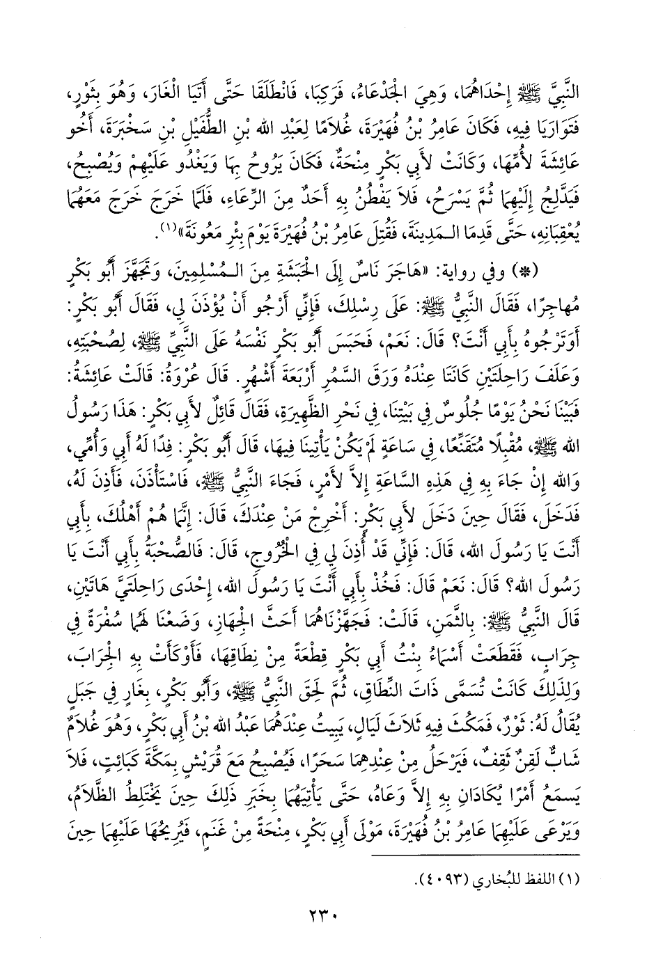 - وفي رواية: «هاجر ناس إلى الحبشة من المسلمين، وتجهز أَبو بكر مهاجرا، فقال النبي صَلى الله عَليه وسَلم: على رسلك، فإني أرجو أن يؤذن لي، فقال أَبو بكر: أوترجوه بأبي أنت؟ قال: نعم، فحبس أَبو بكر نفسه على النبي صَلى الله عَليه وسَلم لصحبته، وعلف راحلتين كانتا عنده ورق السمر أربعة أشهر. قال عروة: قالت عائشة: فبينا نحن يوما جلوس في بيتنا، في نحر الظهيرة، فقال قائل لأَبي بكر: هذا رسول الله صَلى الله عَليه وسَلم مقبلا متقنعا، في ساعة لم يكن يأتينا فيها، قال أَبو بكر: فدا له أبي وأمي، والله إن جاء به في هذه الساعة إلا لأمر، فجاء النبي صَلى الله عَليه وسَلم فاستاذن، فأذن له، فدخل، فقال حين دخل لأَبي بكر: أخرج من عندك، قال: إنما هم أهلك، بأبي أنت يا رسول الله، قال: فإني قد أذن لي في الخروج، قال: فالصحبة بأبي أنت يا رسول الله؟ قال: نعم قال: فخذ بأبي أنت يا رسول الله، إحدى راحلتي هاتين، قال النبي صَلى الله عَليه وسَلم: بالثمن، قالت: فجهزناهما أحث الجهاز، وضعنا لهما سفرة في جراب، فقطعت أسماء بنت أَبي بكر قطعة من نطاقها، فأوكأت به الجراب، ولذلك كانت تسمى ذات النطاق، ثم لحق النبي صَلى الله عَليه وسَلم وأَبو بكر، بغار في جبل يقال له: ثور، فمكث فيه ثلاث ليال، يبيت عندهما عبد الله بن أَبي بكر، وهو غلام شاب لقن ثقف، فيرحل من عندهما سحرا، فيصبح مع قريش بمكة كبائت، فلا يسمع أمرا يكادان به إلا وعاه، حتى يأتيهما بخبر ذلك حين يختلط الظلام، ويرعى عليهما عامر بن فهيرة مولى أَبي بكر، منحة من غنم، فيريحها عليهما حين