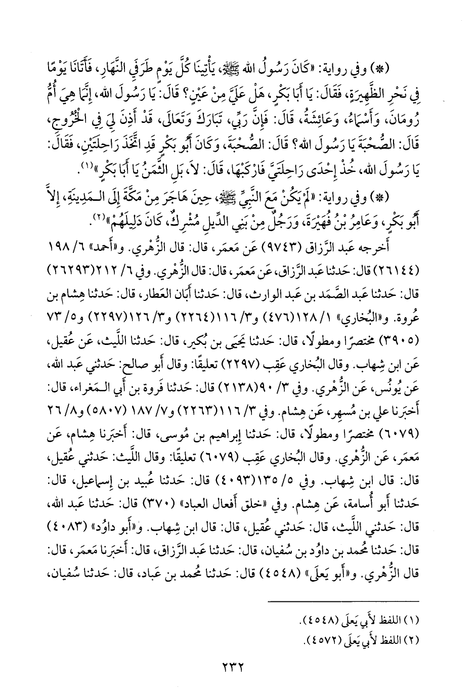 - وفي رواية: «كان رسول الله صَلى الله عَليه وسَلم يأتينا كل يوم طرفي النهار، فأتانا يوما في نحر الظهيرة، فقال: يا أبا بكر، هل علي من عين؟ قال: يا رسول الله، إنما هي أم رومان، وأسماء، وعائشة، قال: فإن ربي، تبارك وتعالى، قد أذن لي في الخروج، قال: الصحبة يا رسول الله؟ قال: الصحبة, وكان أَبو بكر قد اتخذ راحلتين، فقال: يا رسول الله، خذ إحدى راحلتي فاركبها، قال: لا، بل الثمن يا أبا بكر» (¬١).