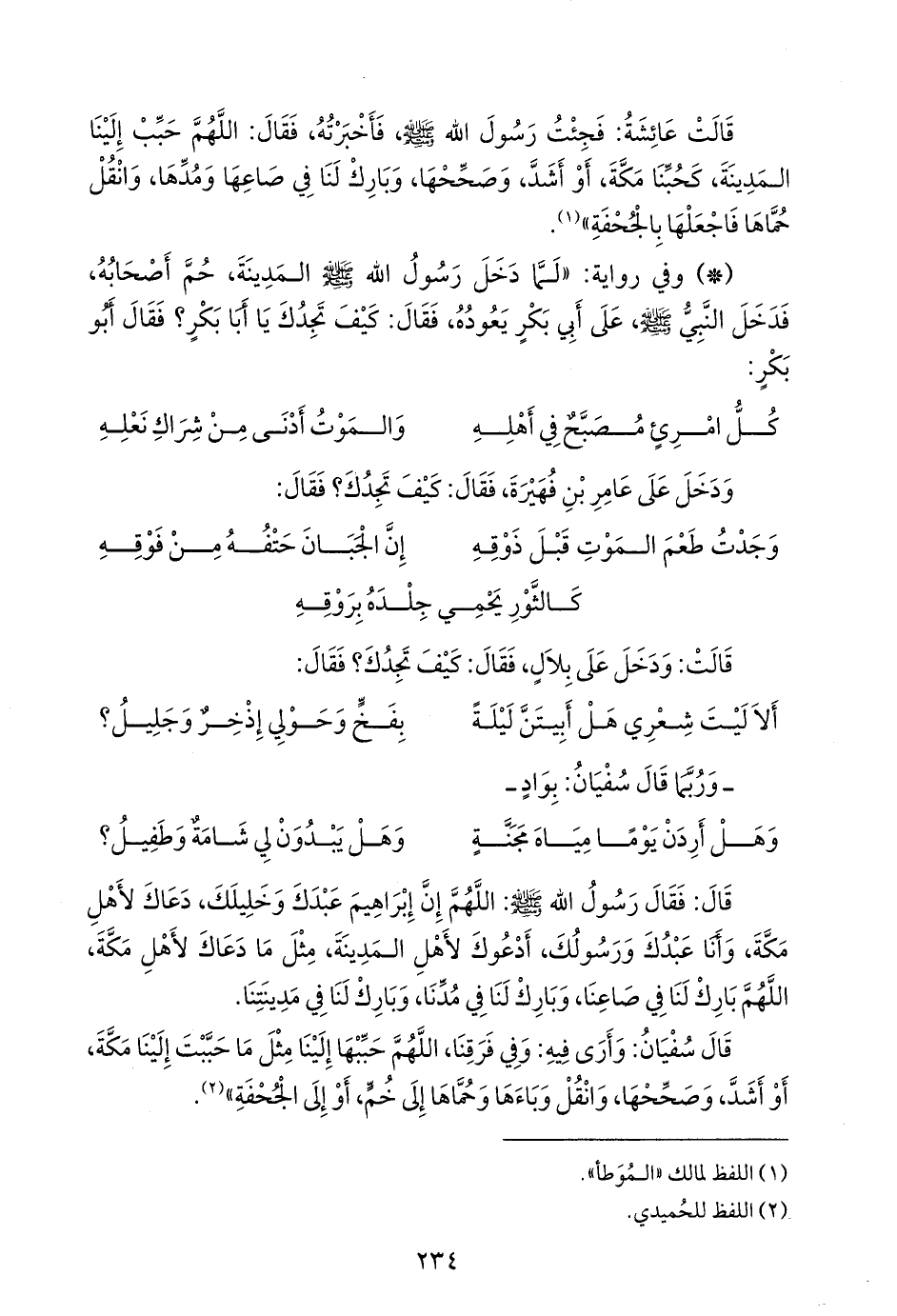قال سفيان: وأرى فيه: وفي فرقنا، اللهم حببها إلينا مثل ما حببت إلينا مكة، أو أشد، وصححها، وانقل وباءها وحماها إلى خم، أو إلى الجحفة» (¬١).