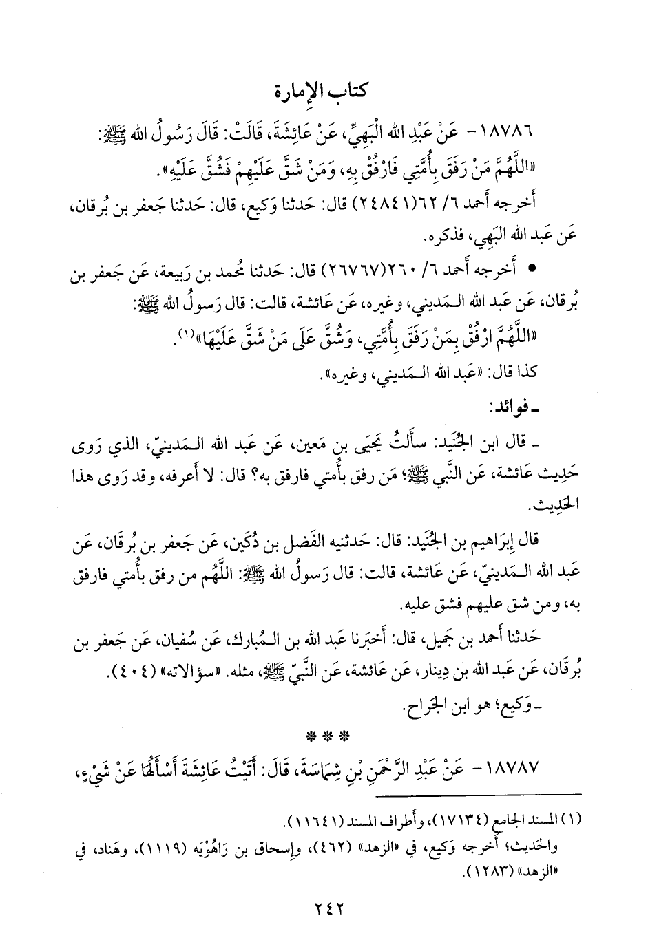 قال إبراهيم بن الجنيد: قال: حدثنيه الفضل بن دُكَين، عن جعفر بن برقان، عن عبد الله المديني، عن عائشة، قالت: قال رسول الله صَلى الله عَليه وسَلم: اللهم من رفق بأمتي فارفق به، ومن شق عليهم فشق عليه.