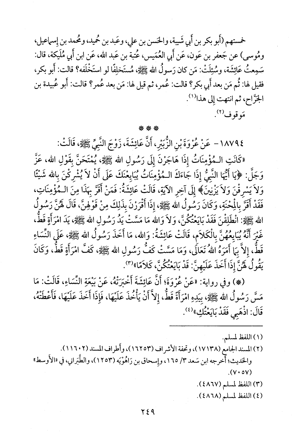 «كانت المؤمنات إذا هاجرن إلى رسول الله صَلى الله عَليه وسَلم يمتحن بقول الله، عز وجل: {يا أيها النبي إذا جاءك المؤمنات يبايعنك على أن لا يشركن بالله شيئًا ولا يسرقن ولا يزنين} إلى آخر الآية، قالت عائشة: فمن أقر بهذا من المؤمنات، فقد أقر بالمحنة، وكان رسول الله صَلى الله عَليه وسَلم إذا أقررن بذلك من قولهن، قال لهن رسول الله صَلى الله عَليه وسَلم: انطلقن فقد بايعتكن، ولا والله ما مست يد رسول الله صَلى الله عَليه وسَلم يد امرأة قط، غير أنه يبايعهن بالكلام، قالت عائشة: والله، ما أخذ رسول الله صَلى الله عَليه وسَلم على النساء قط، إلا بما أمره الله تعالى، وما مست كف رسول الله صَلى الله عَليه وسَلم كف امرأة قط، وكان يقول لهن إذا أخذ عليهن: قد بايعتكن، كلاما» (¬١).