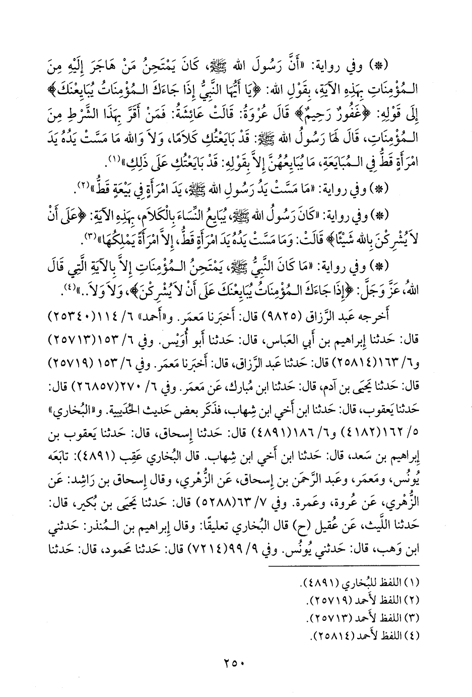 - وفي رواية: «كان رسول الله صَلى الله عَليه وسَلم يبايع النساء بالكلام، بهذه الآية: {على أن لا يشركن بالله شيئا} قالت: وما مست يده يد امرأة قط، إلا امرأة يملكها» (¬٣).