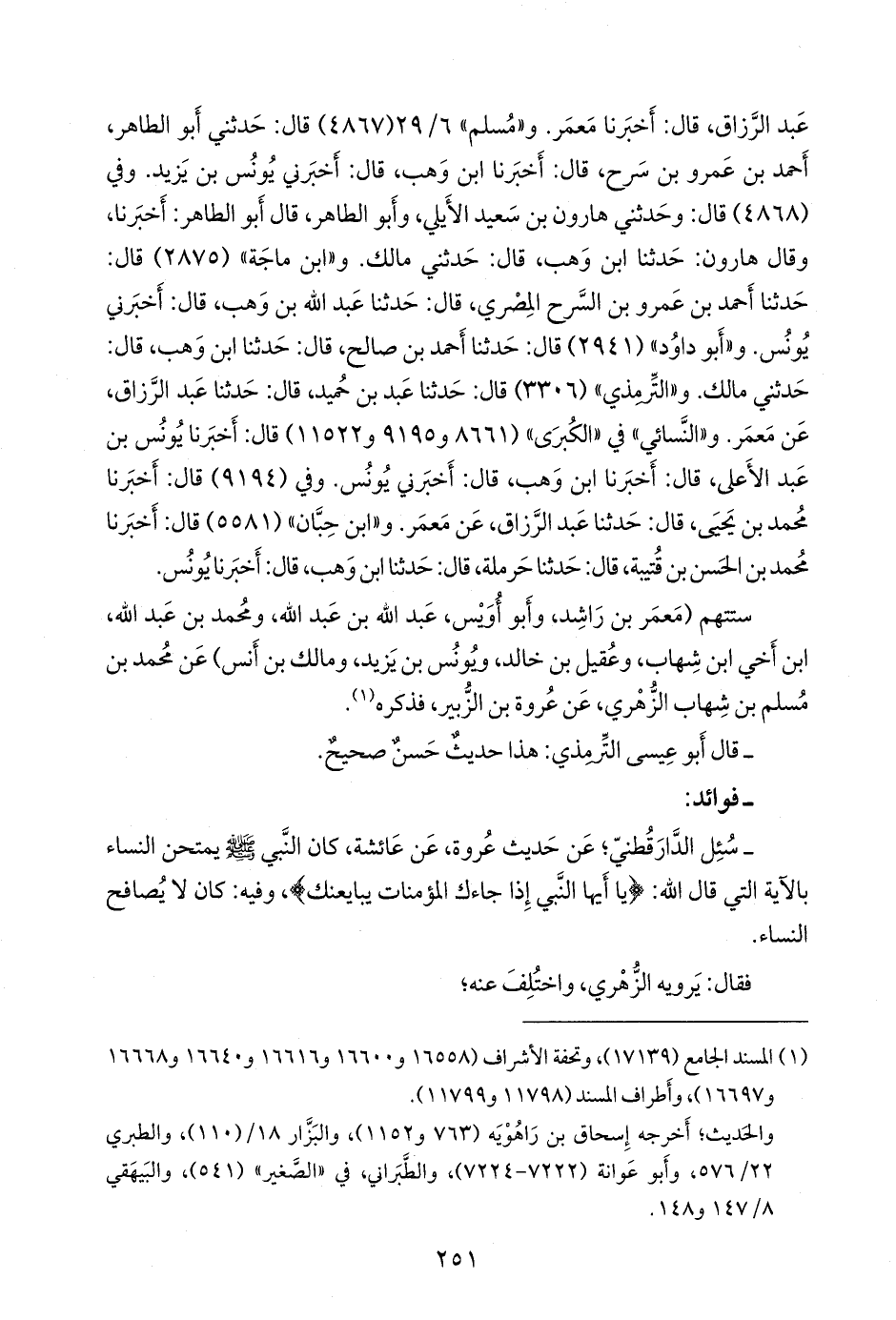 - سئل الدارقُطني؛ عن حديث عروة، عن عائشة، كان النبي صَلى الله عَليه وسَلم يمتحن النساء بالآية التي قال الله: {يا أيها النبي إذا جاءك المؤمنات يبايعنك}، وفيه: كان لا يصافح النساء.