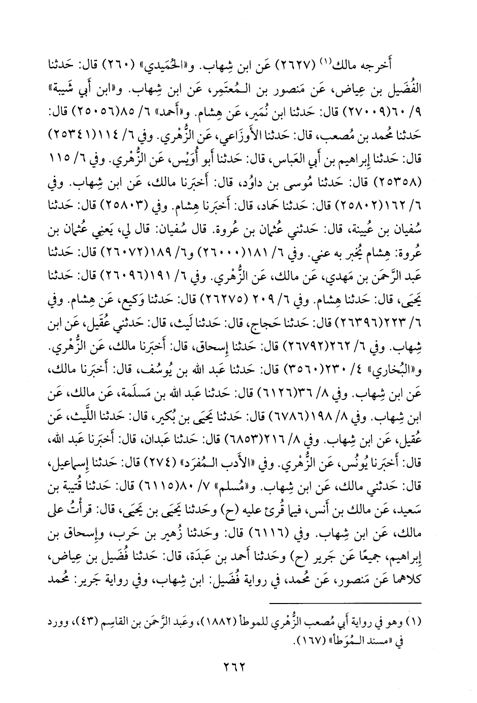 الزُّهْري. وفي (٦١١٧) قال: وحدثنيه حَرملة بن يحيى, قال: أخبرنا ابن وهب, قال: أخبرني يونس، عن ابن شهاب. وفي (٦١١٨) قال: حدثنا أَبو كُريب, قال: حدثنا أَبو أسامة، عن هشام. وفي (٧١١٩) قال: وحدثناه أَبو كُريب، وابن نُمير، جميعا عن عبد الله بن نُمير، عن هشام، بهذا الإسناد. و «أَبو داود» (٤٧٨٥) قال: حدثنا عبد الله بن مَسلَمة، عن مالك، عن ابن شهاب. و «التِّرمِذي» في «الشمائل» (٣٤٩) قال: حدثنا أحمد بن عَبدة الضبي, قال: حدثنا فُضيل بن عِياض، عن منصور، عن الزُّهْري. و «أَبو يَعلى» (٤٣٨٢) قال: حدثنا عبد الأعلى، قال: قرأتُ على مالك بن أنس، عن ابن شهاب. وفي (٤٤٥٢) قال: حدثنا العباس بن الوليد النَّرْسي، قال: حدثنا فُضيل بن عِياض، عن منصور، عن محمد بن شهاب.