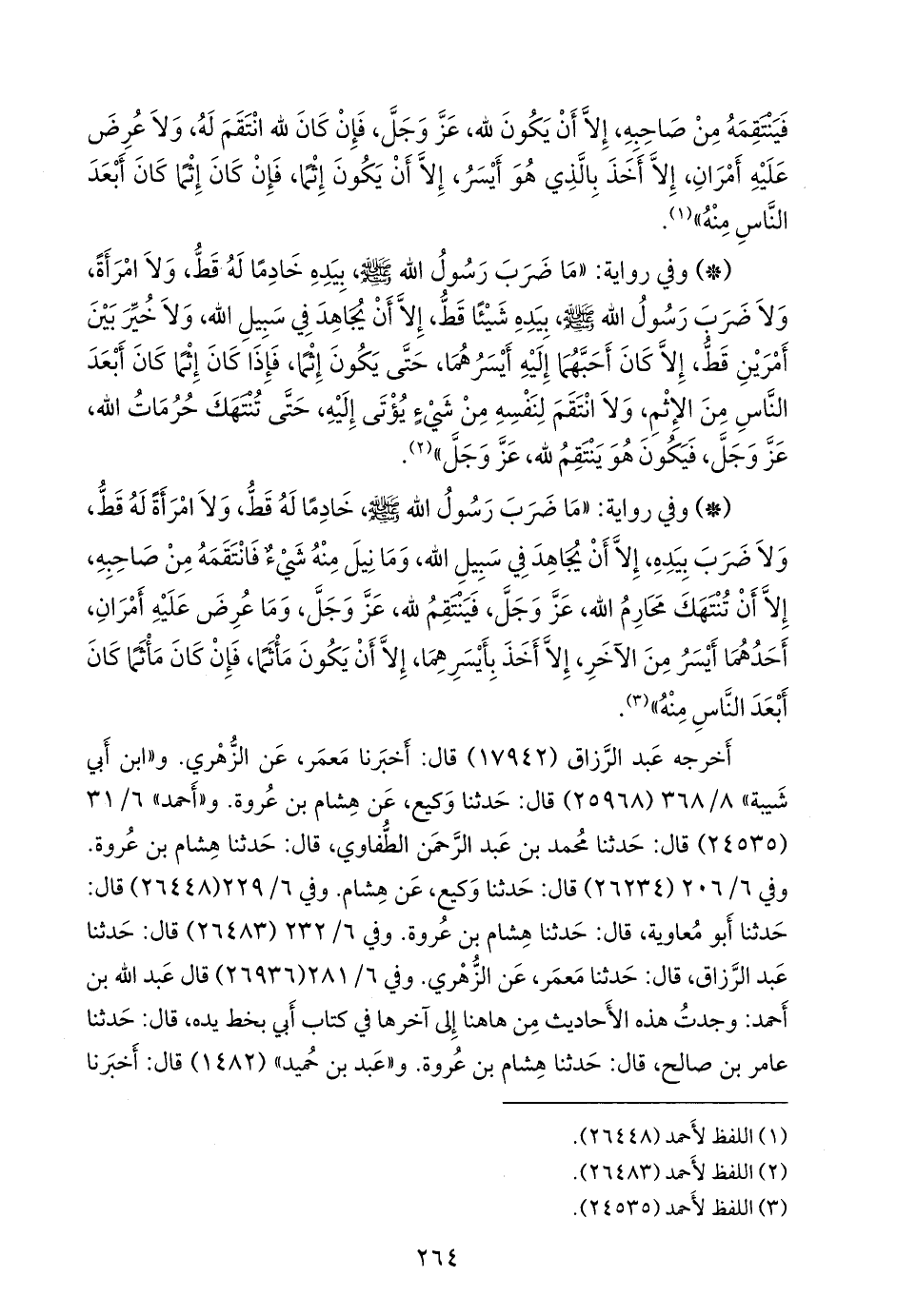 - وفي رواية: «ما ضرب رسول الله صَلى الله عَليه وسَلم خادما له قط، ولا امرأة له قط، ولا ضرب بيده، إلا أن يجاهد في سبيل الله، وما نيل منه شيء فانتقمه من صاحبه، إلا أن تنتهك محارم الله، عز وجل، فينتقم لله، عز وجل، وما عرض عليه أمران، أحدهما أيسر من الآخر، إلا أخذ بأيسرهما، إلا أن يكون ماثما، فإن كان ماثما كان أبعد الناس منه» (¬١).