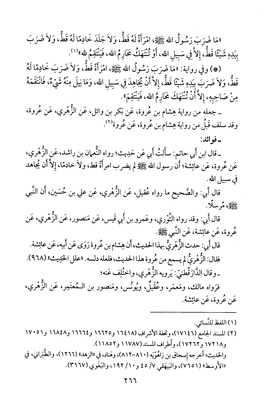 - قال ابن أبي حاتم: سألت أبي عن حديث؛ رواه النعمان بن راشد، عن الزُّهْري، عن عروة، عن عائشة؛ أن رسول الله صَلى الله عَليه وسَلم لم يضرب امرأة قط، ولا خادما، إلا أن يجاهد في سبيل الله.