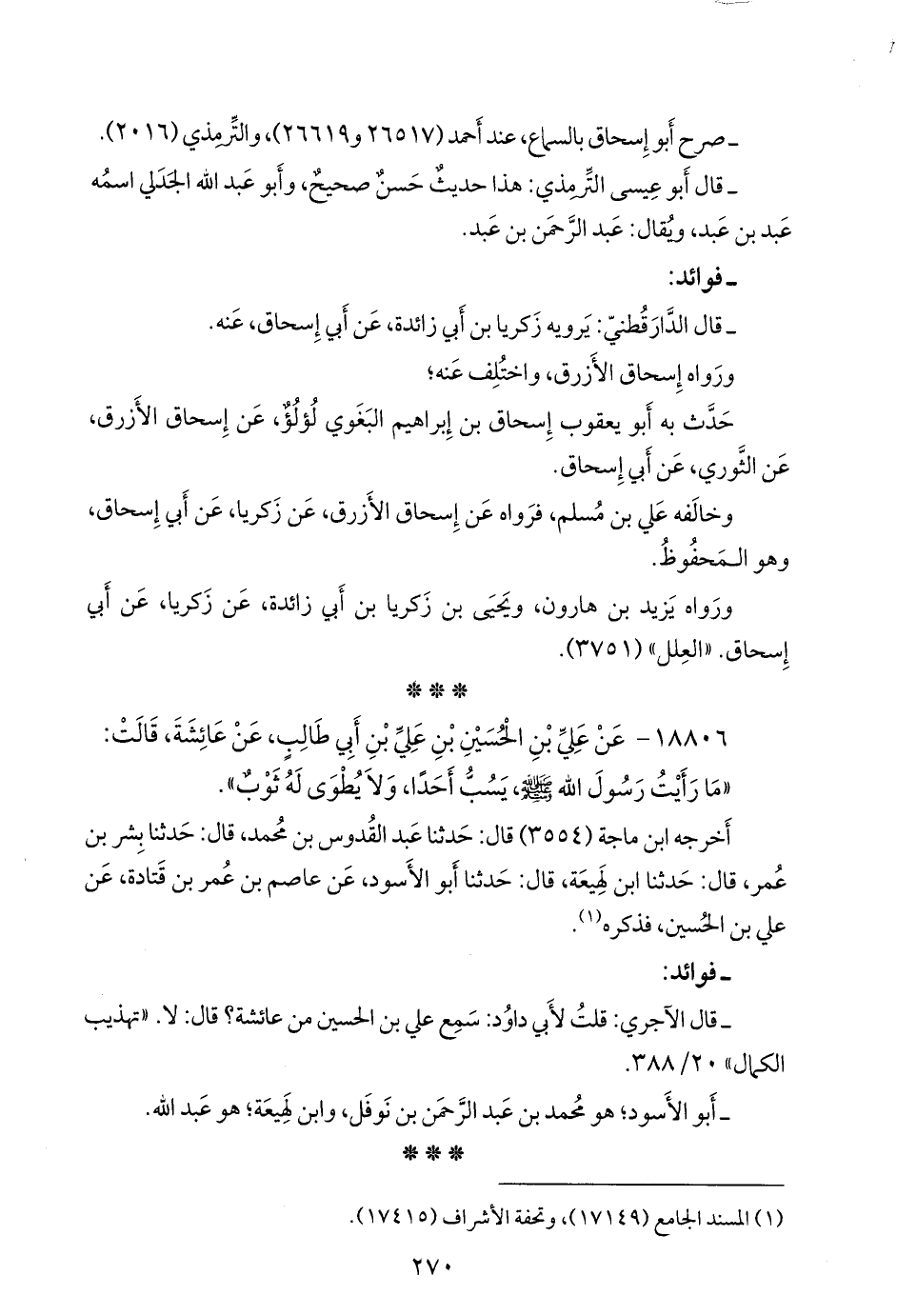 - وقال الآجري: قلت لأبي داود: سمع علي بن الحسين من عائشة؟ قال: لا. «تهذيب الكمال» ٢٠/ ٣٨٨.