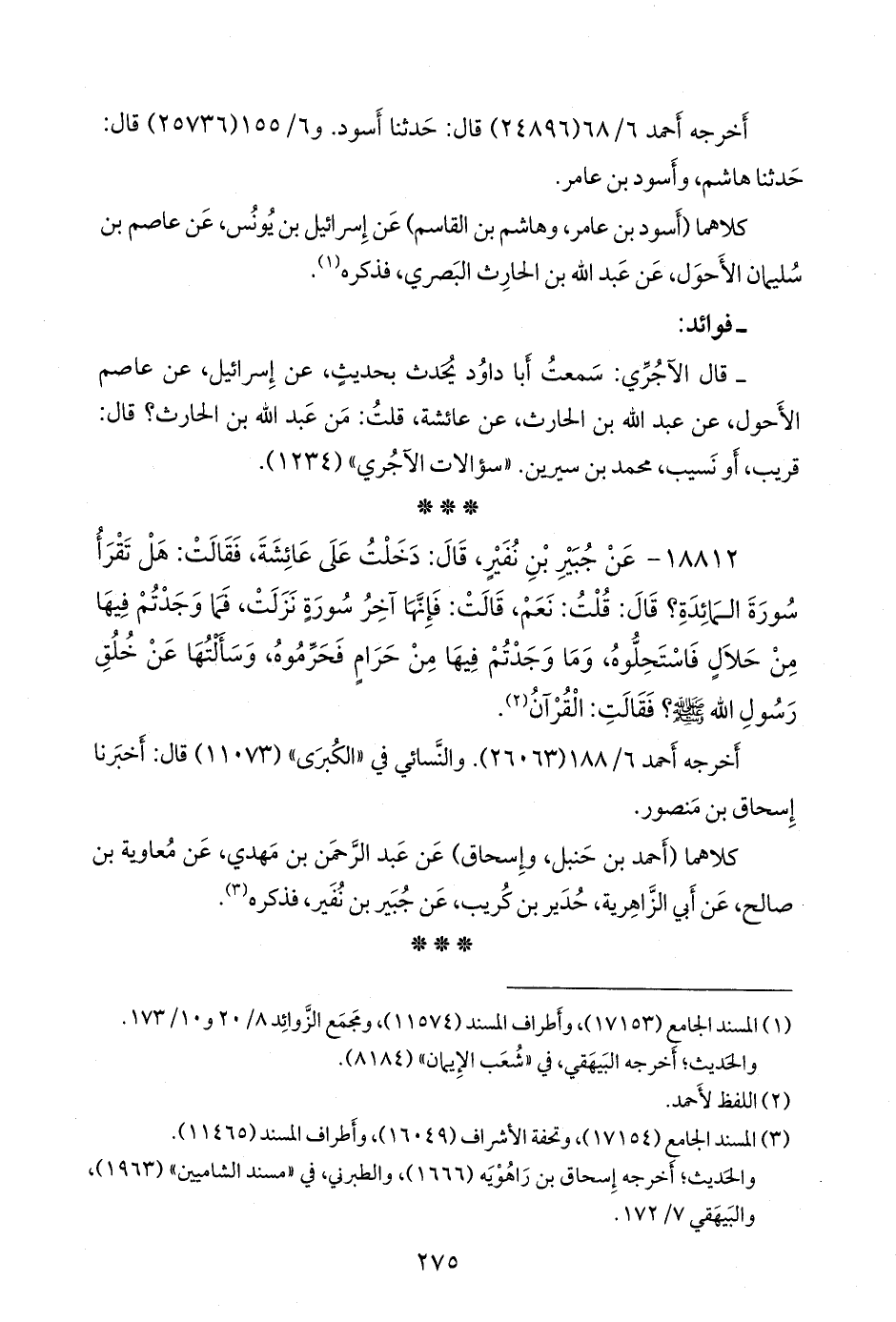 ١٨٨١٢ - عن جُبير بن نُفير، قال: دخلت على عائشة، فقالت: هل تقرأ سورة المائدة؟ قال: قلت: نعم، قالت: فإنها آخر سورة نزلت، فما وجدتم فيها من حلال فاستحلوه، وما وجدتم فيها من حرام فحرموه، وسألتها عن خلق رسول الله صَلى الله عَليه وسَلم؟ فقالت: القرآن (¬١).