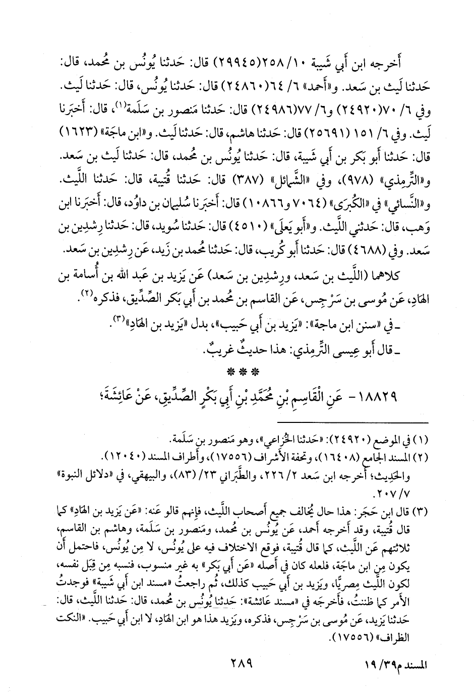 (¬٢) قال ابن حجر: هذا حال يخالف جميع أصحاب الليث، فإنهم قالو عنه: «عن يزيد بن الهاد» كما قال قتيبة، وقد أخرجه أحمد، عن يونس بن محمد، ومنصور بن سلمة، وهاشم بن القاسم، ثلاثتهم عن الليث، كما قال قتيبة، فوقع الاختلاف فيه على يونس، لا من يونس، فاحتمل أن يكون من ابن ماجة، فلعله كان في أصله «عن أَبي بكر» به غير منسوب، فنسبه من قبل نفسه، لكون الليث مصريا، ويزيد بن أبي حبيب كذلك، ثم راجعت «مسند ابن أبي شيبة» فوجدت الأمر كما ظننت، فأخرجه في «مسند عائشة»: حدثنا يونس بن محمد، قال: حدثنا الليث، قال: حدثنا يزيد، عن موسى بن سرجس، فذكره، ويزيد هذا هو ابن الهاد، لا ابن أبي حبيب. «النكت الظراف» (١٧٥٥٦).