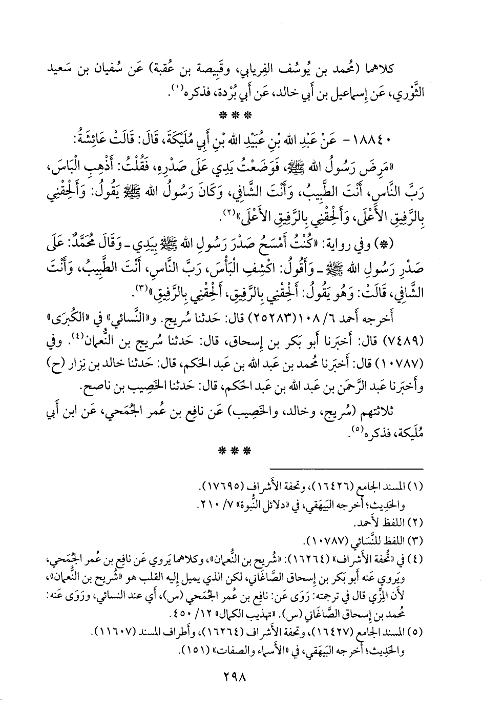 - وفي رواية: «كنت أمسح صدر رسول الله صَلى الله عَليه وسَلم بيدي، وقال محمد: على صدر رسول الله صَلى الله عَليه وسَلم وأقول: اكشف الباس، رب الناس، أنت الطبيب، وأنت الشافي، قالت: وهو يقول: ألحقني بالرفيق، ألحقني بالرفيق» (¬٢).