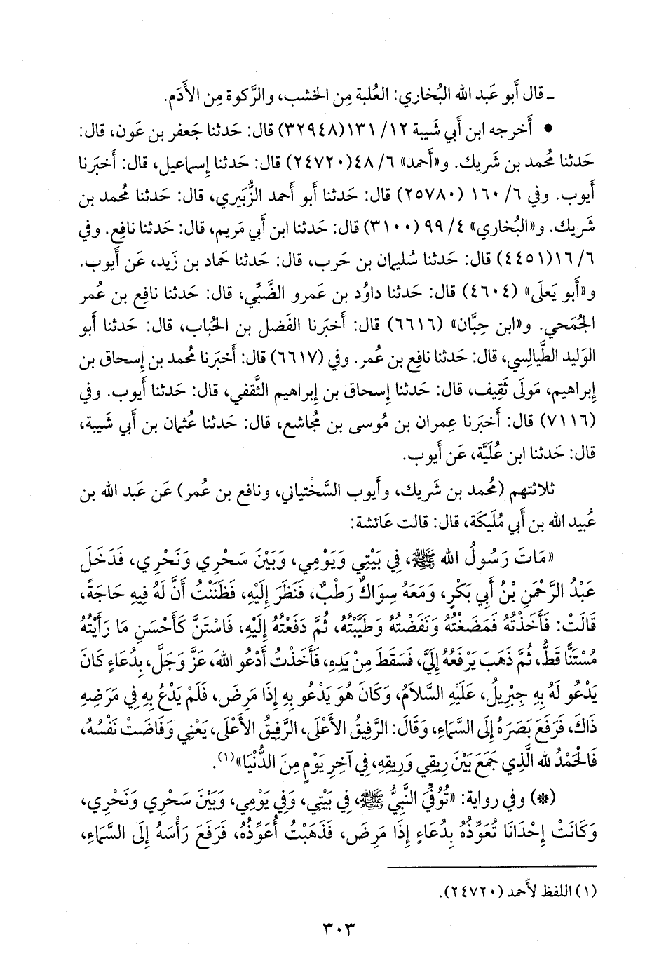 - وفي رواية: «توفي النبي صَلى الله عَليه وسَلم في بيتي، وفي يومي، وبين سحري ونحري، وكانت إحدانا تعوذه بدعاء إذا مرض، فذهبت أعوذه، فرفع رأسه إلى السماء،