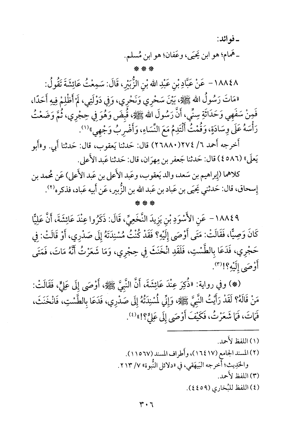 ١٨٨٤٩ - عن الأسود بن يزيد النَّخَعي، قال: ذكروا عند عائشة، أن عليا كان وصيا، فقالت: متى أوصى إليه؟ فقد كنت مسندته إلى صدري، أو قالت: في حجري، فدعا بالطست، فلقد انخنث في حجري، وما شعرت أنه مات، فمتى أوصى إليه؟! (¬١).