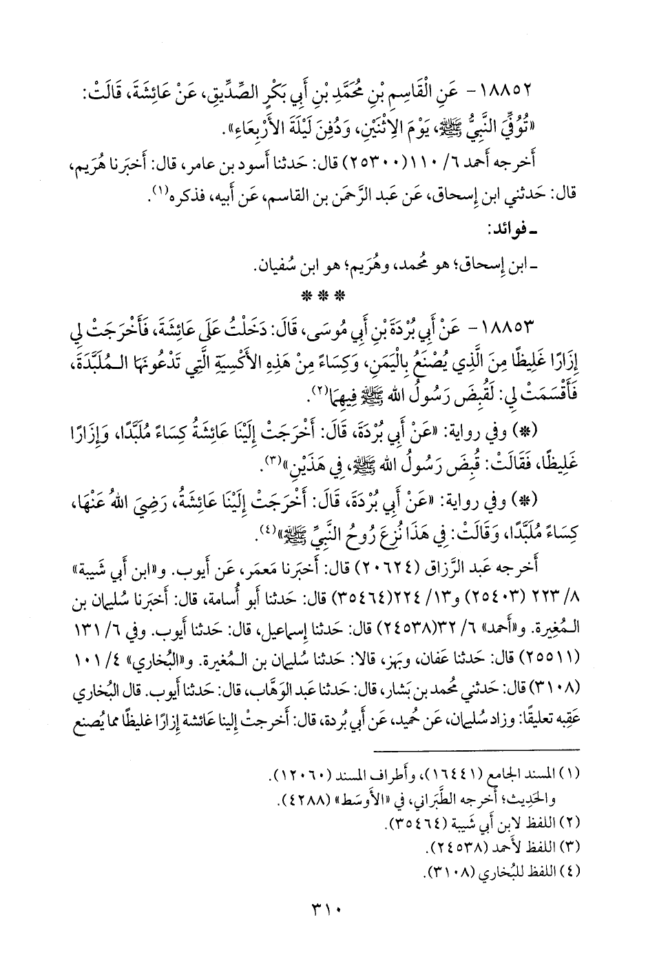 ١٨٨٥٢ - عن القاسم بن محمد بن أَبي بكر الصِّدِّيق، عن عائشة، قالت: