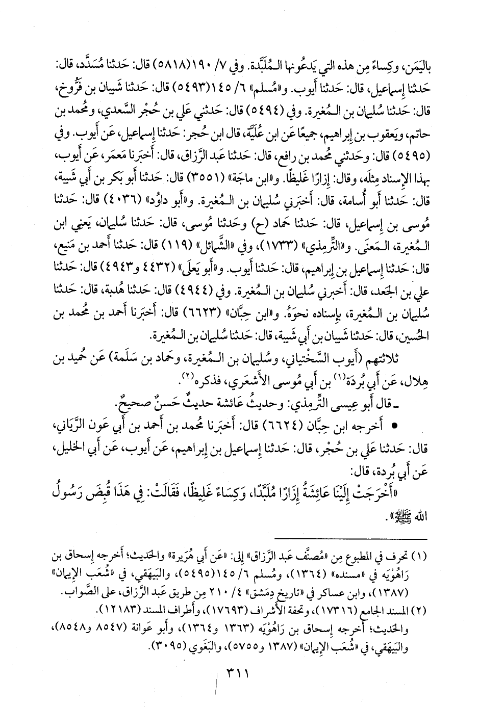 و «ابن ماجة» (٣٥٥١) قال: حدثنا أَبو بكر بن أبي شيبة, قال: حدثنا أَبو أسامة, قال: أخبرني سليمان بن المغيرة. و «أَبو داود» (٤٠٣٦) قال: حدثنا موسى بن إسماعيل, قال: حدثنا حماد (ح) وحدثنا موسى, قال: حدثنا سليمان، يعني ابن المغيرة، المعنى. و «التِّرمِذي» (١٧٣٣)، وفي «الشمائل» (١١٩) قال: حدثنا أحمد بن مَنيع, قال: حدثنا إسماعيل بن إبراهيم, قال: حدثنا أيوب. و «أَبو يَعلى» (٤٤٣٢ و ٤٩٤٣) قال: حدثنا علي بن الجعد، قال: أخبرني سليمان بن المغيرة. وفي (٤٩٤٤) قال: حدثنا هُدبة، قال: حدثنا سليمان بن المغيرة، بإسناده نحوه. و «ابن حِبَّان» (٦٦٢٣) قال: أخبرنا أحمد بن محمد بن الحسين، قال: حدثنا شَيبان بن أبي شيبة، قال: حدثنا سليمان بن المغيرة.