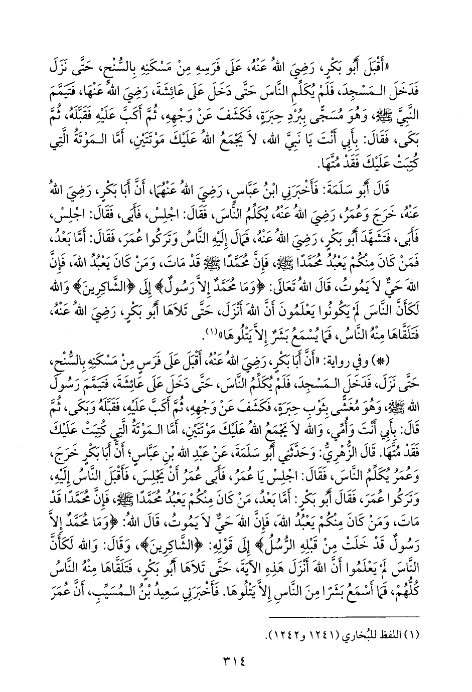 - وفي رواية: «أن أبا بكر، رضي الله عنه، أقبل على فرس من مسكنه بالسنح، حتى نزل، فدخل المسجد، فلم يكلم الناس، حتى دخل على عائشة، فتيمم رسول الله صَلى الله عَليه وسَلم وهو مغشى بثوب حبرة، فكشف عن وجهه، ثم أكب عليه، فقبله وبكى، ثم قال: بأبي أنت وأمي، والله لا يجمع الله عليك موتتين، أما الموتة التي كتبت عليك فقد متها. قال الزُّهْري: وحدثني أَبو سلمة، عن عبد الله بن عباس؛ أن أبا بكر خرج، وعمر يكلم الناس، فقال: اجلس يا عمر، فأبى عمر أن يجلس، فأقبل الناس إليه، وتركوا عمر، فقال أَبو بكر: أما بعد، من كان منكم يعبد محمدا صَلى الله عَليه وسَلم فإن محمدا قد مات، ومن كان منكم يعبد الله، فإن الله حي لا يموت، قال الله: {وما محمد إلا رسول قد خلت من قبله الرسل} إلى قوله: {الشاكرين}، وقال: والله لكأن الناس لم يعلموا أن الله أنزل هذه الآية، حتى تلاها أَبو بكر، فتلقاها منه الناس كلهم، فما أسمع بشرا من الناس إلا يتلوها. فأخبرني سعيد بن المُسَيب، أن عمر