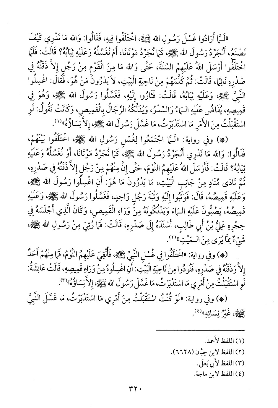 - وفي رواية: «اختلفوا في غسل النبي صَلى الله عَليه وسَلم فألقي عليهم النوم، فما منهم أحد إلا وذقنه في صدره، فنودوا من ناحية البيت: أن اغسلوه من وراء قميصه، قالت عائشة: لو استقبلت من أمري ما استدبرت، ما غسل رسول الله صَلى الله عَليه وسَلم إلا نساؤه» (¬١).