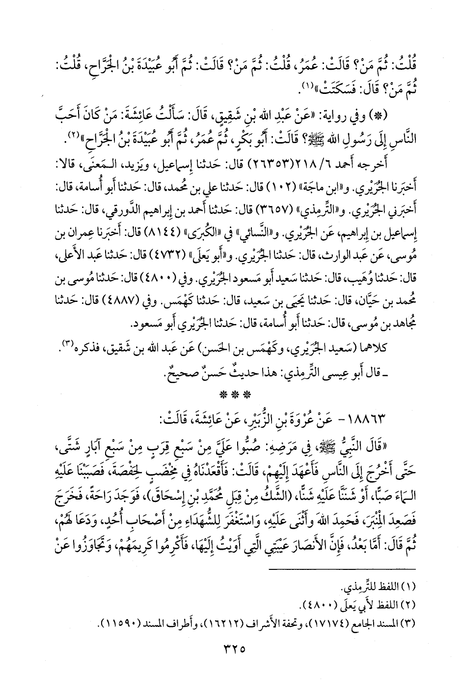 و «التِّرمِذي» (٣٦٥٧) قال: حدثنا أحمد بن إبراهيم الدورقي, قال: حدثنا إسماعيل بن إبراهيم، عن الجُريري. و «النَّسَائي» في «الكبرى» (٨١٤٤) قال: أخبرنا عمران بن موسى، عن عبد الوارث، قال: حدثنا الجُريري. و «أَبو يَعلى» (٤٧٣٢) قال: حدثنا عبد الأعلى، قال: حدثنا وهيب، قال: حدثنا سعيد أَبو مسعود الجُريري. وفي (٤٨٠٠) قال: حدثنا موسى بن محمد بن حيان، قال: حدثنا يحيى بن سعيد، قال: حدثنا كهمس. وفي (٤٨٨٧) قال: حدثنا مجاهد بن موسى، قال: حدثنا أَبو أسامة، قال: حدثنا الجُريري أَبو مسعود.