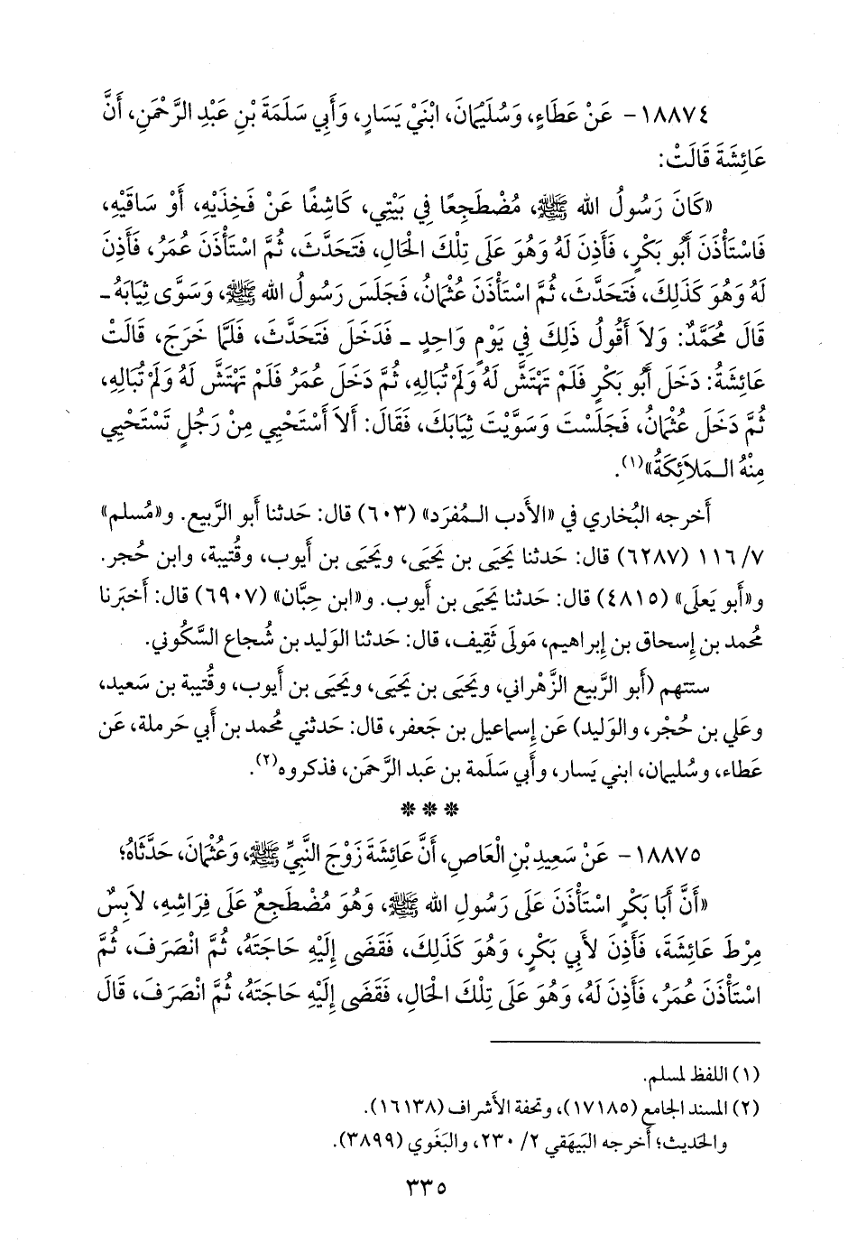 «كان رسول الله صَلى الله عَليه وسَلم مضطجعا في بيتي، كاشفا عن فخذيه، أو ساقيه، فاستاذن أَبو بكر، فأذن له وهو على تلك الحال، فتحدث، ثم استاذن عمر، فأذن له وهو كذلك، فتحدث، ثم استاذن عثمان، فجلس رسول الله صَلى الله عَليه وسَلم وسوى ثيابه ـ قال محمد: ولا أقول ذلك في يوم واحد ـ فدخل فتحدث، فلما خرج، قالت عائشة: دخل أَبو بكر فلم تهتش له ولم تباله، ثم دخل عمر فلم تهتش له ولم تباله، ثم دخل عثمان، فجلست وسويت ثيابك، فقال: ألا أستحيي من رجل تستحيي منه الملائكة» (¬١).