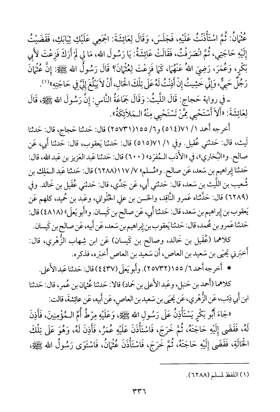 «جاء أَبو بكر يستاذن على رسول الله صَلى الله عَليه وسَلم وعليه مرط أُم المؤمنين، فأذن له، فقضى إليه حاجته، ثم خرج، فاستاذن عليه عمر، فأذن له، وهو على تلك الحالة، فقضى إليه حاجته، ثم خرج، فاستاذن عثمان، فاستوى رسول الله صَلى الله عَليه وسَلم