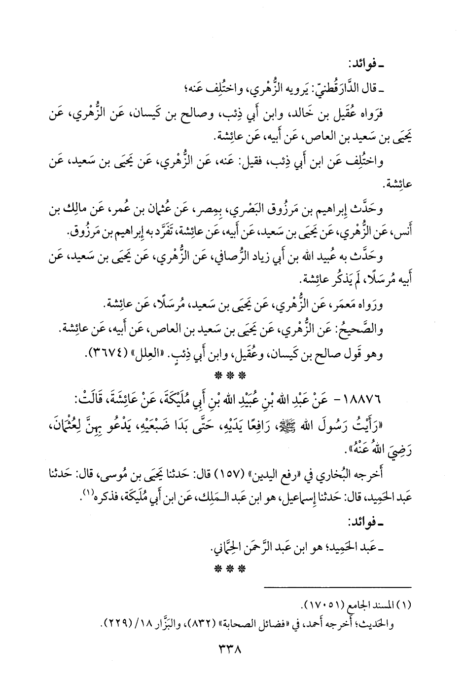 - وقال الدارقُطني أيضا: قال علي بن المديني، في مسند عثمان: روى صالح بن كَيْسان، عن الزُّهْري، عن يحيى بن سعيد، عن أبيه، عن عائشة، وعثمان.