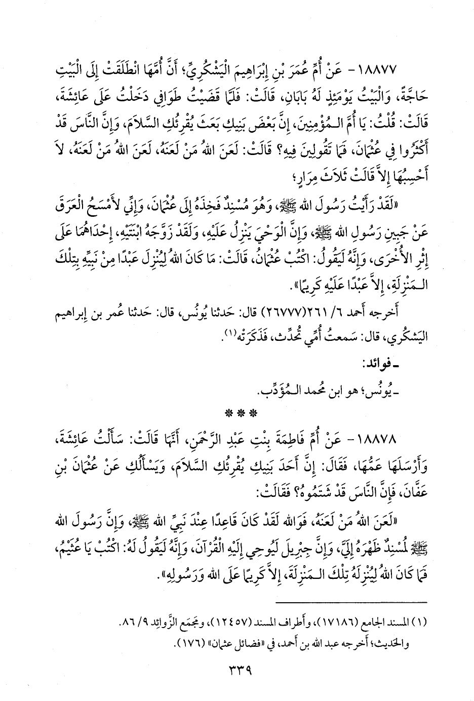 ١٨٨٧٧ - عن أم عمر بن إبراهيم اليشكري؛ أن أمها انطلقت إلى البيت حاجة، والبيت يومئذ له بابان، قالت: فلما قضيت طوافي دخلت على عائشة، قالت: قلت: يا أُم المؤمنين، إن بعض بنيك بعث يقرئك السلام، وإن الناس قد أكثروا في عثمان، فما تقولين فيه؟ قالت: لعن الله من لعنه، لعن الله من لعنه، لا أحسبها إلا قالت ثلاث مرار؛