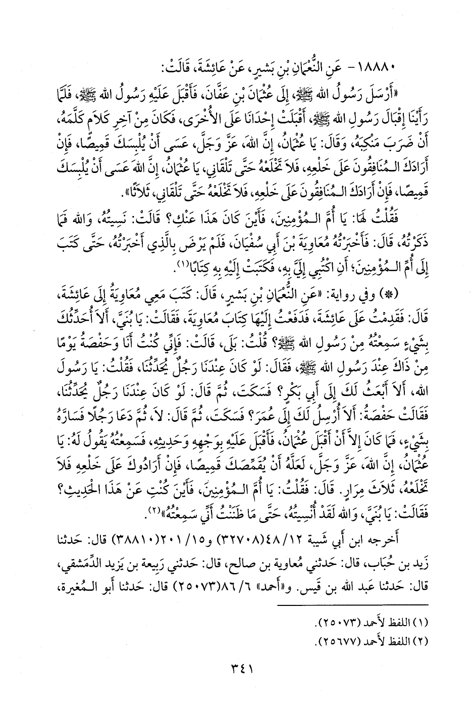 - وفي رواية: «عن النعمان بن بشير، قال: كتب معي معاوية إلى عائشة، قال: فقدمت على عائشة، فدفعت إليها كتاب معاوية، فقالت: يا بني، ألا أحدثك بشيء سمعته من رسول الله صَلى الله عَليه وسَلم؟ قلت: بلى، قالت: فإني كنت أنا وحفصة يوما من ذاك عند رسول الله صَلى الله عَليه وسَلم فقال: لو كان عندنا رجل يحدثنا، فقلت: يا رسول الله، ألا أبعث لك إلى أَبي بكر؟ فسكت، ثم قال: لو كان عندنا رجل يحدثنا، فقالت حفصة: ألا أرسل لك إلى عمر؟ فسكت، ثم قال: لا، ثم دعا رجلا فساره بشيء، فما كان إلا أن أقبل عثمان، فأقبل عليه بوجهه وحديثه، فسمعته يقول له: يا عثمان، إن الله، عز وجل، لعله أن يقمصك قميصا، فإن أرادوك على خلعه فلا تخلعه، ثلاث مرار. قال: فقلت: يا أُم المؤمنين، فأين كنت عن هذا الحديث؟ فقالت: يا بني، والله لقد أنسيته، حتى ما ظننت أني سمعته» (¬٢).