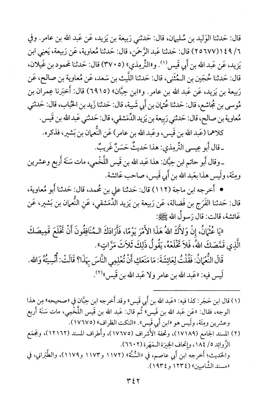 وفي ٦/ ١٤٩ (٢٥٦٧٧) قال: حدثنا عبد الرَّحمَن, قال: حدثنا معاوية، عن ربيعة، يعني ابن يزيد، عن عبد الله بن أبي قيس (¬١). و «التِّرمِذي» (٣٧٠٥) قال: حدثنا محمود بن غَيلان, قال: حدثنا حُجَين بن المثنى, قال: حدثنا الليث بن سعد، عن معاوية بن صالح، عن ربيعة بن يزيد، عن عبد الله بن عامر. و «ابن حِبَّان» (٦٩١٥) قال: أخبرنا عمران بن موسى بن مجاشع، قال: حدثنا عثمان بن أبي شيبة، قال: حدثنا زيد بن الحُبَاب، قال: حدثني معاوية بن صالح، قال: حدثني ربيعة بن يزيد الدمشقي، قال: حدثني عبد الله بن قيس.