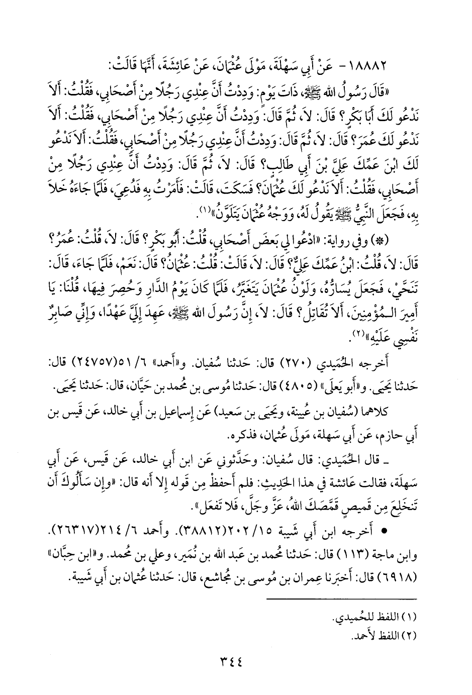 - وفي رواية: «عَنْ أَبِي سَهْلَةَ مَوْلَى عُثْمَانَ، قَالَ: قَالَ رَسُولُ اللهِ صَلى الله عَليه وسَلم فِي مَرَضِهِ: وَدِدْتُ أَنَّ عِنْدِي بَعْضَ أَصْحَابِي، فَقَالَتْ عَائِشَةُ: أَدْعُو لَكَ أَبَا بَكْرٍ؟ قَالَتْ: فَسَكَتَ, فَعَرَفْتُ أَنَّهُ لَا يُرِيدُهُ, فَقُلْتُ: أَدْعُو لَكَ عُمَرَ؟ فَسَكَتَ, فَعَرَفْتُ أَنَّهُ لَا يُرِيدُهُ, قُلْتُ: فَأَدْعُو لَكَ عَلِيًّا؟ فَسَكَتَ, فَعَرَفْتُ أَنَّهُ لَا يُرِيدُهُ, قُلْتُ: فَأَدْعُو لَكَ عُثْمَانَ بْنَ عَفَّانَ؟ قَالَ: نَعَمْ, فَدَعَوْتُهُ، فَلَمَّا جَاءَ أَشَارَ إِلَيَّ النَّبِيُّ صَلى الله عَليه وسَلم: أَنْ تَبَاعَدِي, فَجَاءَ فَجَلَسَ إِلَى النَّبِيِّ صَلى الله عَليه وسَلم فَجَعَلَ رَسُولُ اللهِ صَلى الله عَليه وسَلم يَقُولُ لَهُ، وَلَوْنُ عُثْمَانَ يَتَغَيَّرُ».