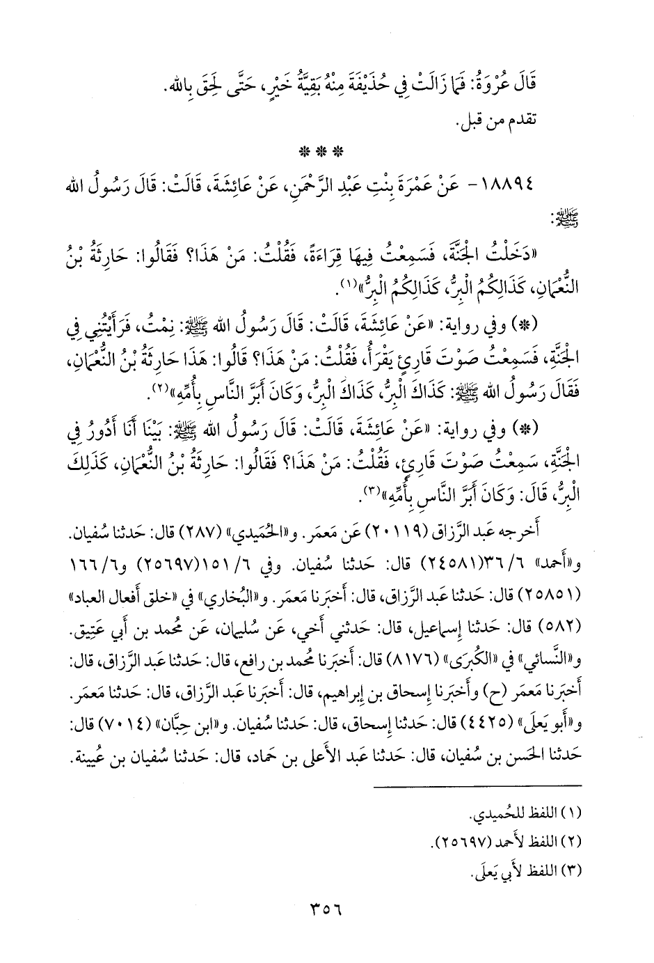 - وفي رواية: «عن عائشة، قالت: قال رسول الله صَلى الله عَليه وسَلم: نمت، فرأيتني في الجنة، فسمعت صوت قارئ يقرأ، فقلت: من هذا؟ قالوا: هذا حارثة بن النعمان، فقال رسول الله صَلى الله عَليه وسَلم: كذاك البر، كذاك البر، وكان أبر الناس بأمه» (¬٢).