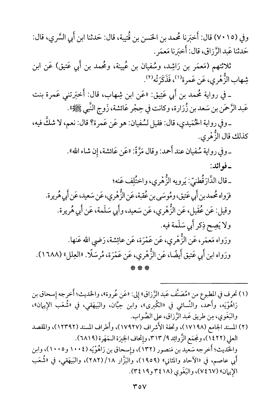 (¬٢) أضاف محقق طبعة دار أطلس هنا: «عن عائشة»، وكتب: سقط من الأصل، و (هـ)، والصواب أَن شيئًا لم يسقط، وأن محمد بن أَبي عتيق رواه مرسلا، ليس فيه: «عن عائشة»، انظر قول الدَّارَقطني في الفوائد، ويُزاد هنا: أخرجه الدَّارَقطني من طريق محمد بن إسماعيل البخاري، قال: حدثنا إِسماعيل، قال: حدثنا أَخي، عن سليمان، قال: حدثني محمد بن أَبي عتيق، عن ابن شهاب، أَخبرتني عَمرَة بنت عبد الرَّحمَن بن سعد بن زرارة، وكانت في حجر عائشة، رضي الله عنها، زوج النبي صَلى الله عَليه وسَلم أَن رسول الله صَلى الله عَليه وسَلم قال: بينما أَنا نائِم، الحديثَ. «العلل» (١٦٨٨).