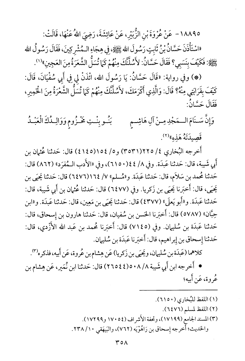 «أن حسان بن ثابت سأل النبي صَلى الله عَليه وسَلم أن يهجو أبا سفيان، قال: فكيف بقرابتي؟ قال: والذي أكرمك، لأسلنك منهم سل الشعرة من العجين». «مُرسَل».