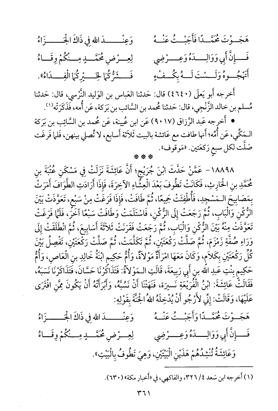 ١٨٨٩٨ - عمن حدث ابن جُريج؛ أن عائشة نزلت في مسكن عتبة بن محمد بن الحارث، فكانت تطوف بعد العشاء الآخرة، فإذا أرادت الطواف أمرت بمصابيح المسجد، فأطفئت جميعا، ثم طافت، فإذا فرغت من سبع، تعوذت بين الركن والباب، ثم رجعت إلى الركن، فاستلمت وطافت سبعا آخر، فلما فرغت تعوذت منه بين الركن والباب، ثم رجعت فقرنت ثلاثة أسابيع، ثم انطلقت إلى وراء صفة زمزم، ثم صلت ركعتين، ثم تكلمت، ثم صلت ركعتين، تفصل بين كل ركعتين بكلام، وكان معها امرأة مولاة، وأم حكيم ابنة خالد بن العاص، وأم حكيم بنت عبد الله بن أبي ربيعة، قالت المولاة: فتذاكرنا حسان، فَابْتَدَرْنَاهُ (¬١) نسبه، فقالت عائشة: ابن الفريعة تَسْبُبْنَ؟ (¬٢)، فنهتنا أن نسبه، وأبرأته أن يكون ممن افترى عليها، وقالت: إني لأرجو أن يدخله الله الجنة بقوله: