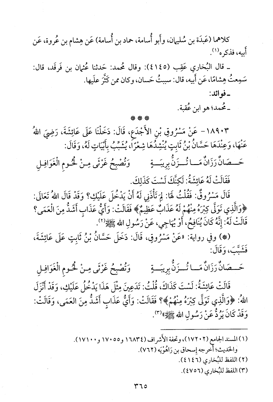 ١٨٩٠٣ - عن مسروق بن الأجدع، قال: دخلنا على عائشة، رضي الله عنها، وعندها حسان بن ثابت ينشدها شعرا، يشبب بأبيات له، وقال:
