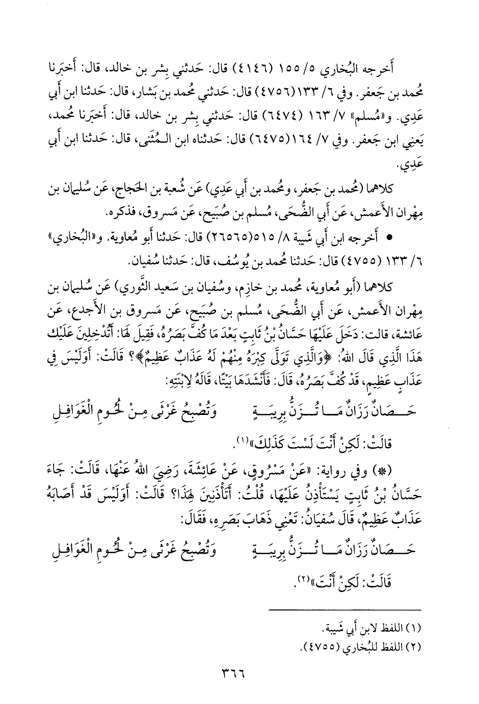 كلاهما (أَبو معاوية محمد بن خازم، وسفيان بن سعيد الثوري) عن سليمان بن مِهران الأعمش، عن أبي الضحى مسلم بن صُبَيح، عن مسروق بن الأجدع، عن عائشة، قالت: دخل عليها حسان بن ثابت بعد ما كف بصره، فقيل لها: أتدخلين عليك هذا الذي قال الله: {والذي تولى كبره منهم له عذاب عظيم}؟ قالت: أوليس في عذاب عظيم، قد كف بصره، قال: فأنشدها بيتا، قاله لابنته: