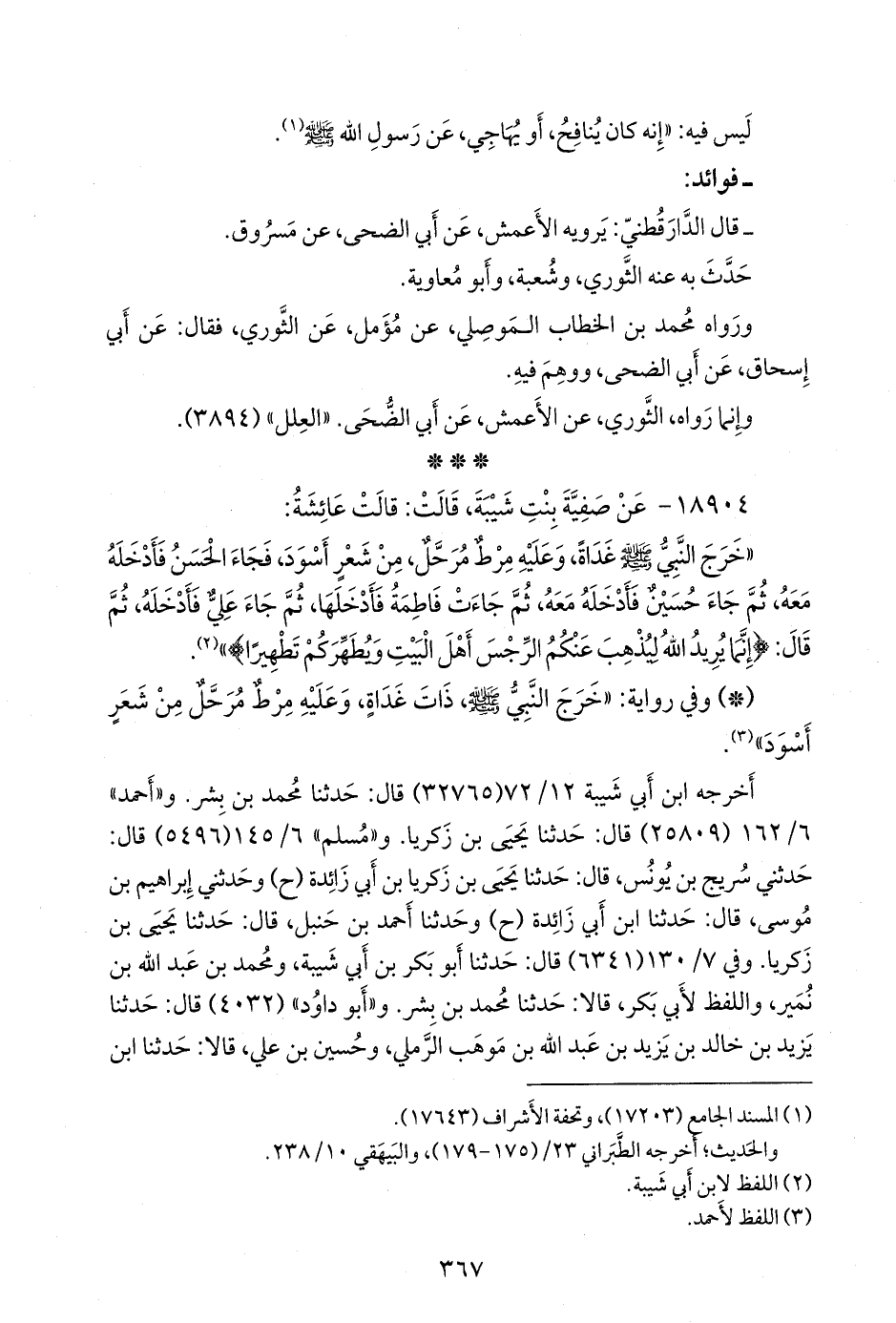 «خرج النبي صَلى الله عَليه وسَلم غداة، وعليه مرط مرحل، من شعر أسود, فجاء الحسن فأدخله معه, ثم جاء حسين فأدخله معه, ثم جاءت فاطمة فأدخلها, ثم جاء علي فأدخله, ثم قال: {إنما يريد الله ليذهب عنكم الرجس أهل البيت ويطهركم تطهيرا}» (¬١).