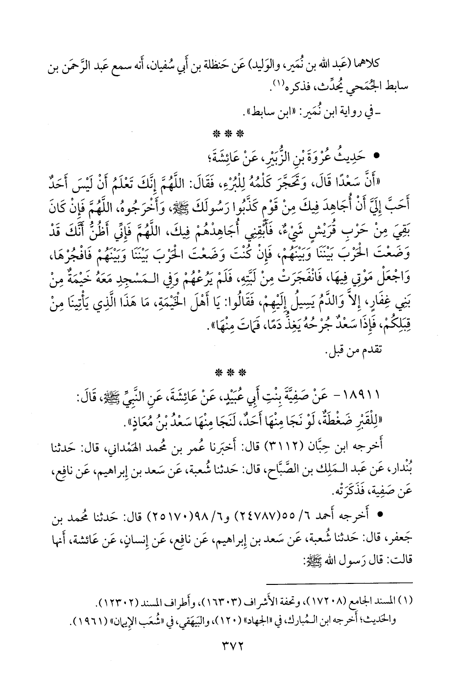 ١٨٩١١ - عن صفية بنت أبي عبيد، عن عائشة، عن النبي صَلى الله عَليه وسَلم قال: