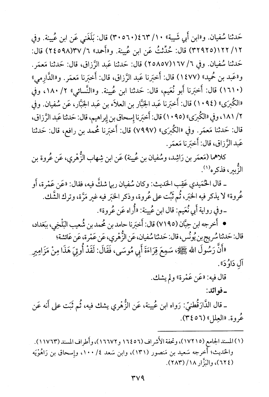 كلاهما (مَعمَر بن راشد، وسفيان بن عُيينة) عن ابن شهاب الزُّهْري، عن عروة بن الزبير، فذكره (¬١).
