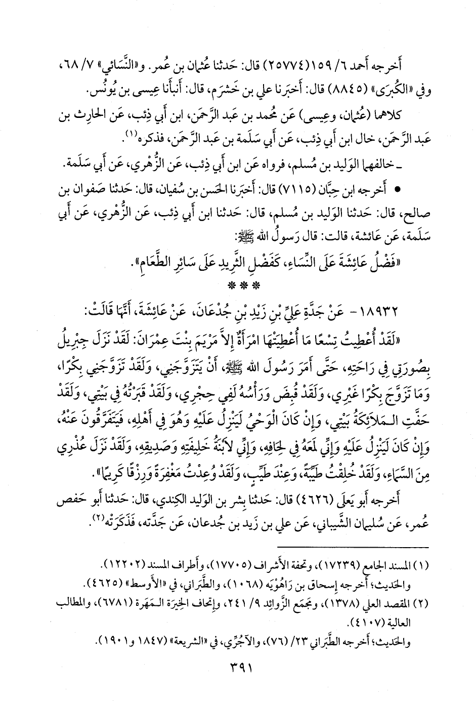 «لقد أعطيت تسعا ما أعطيتها امرأة إلا مريم بنت عمران: لقد نزل جبريل بصورتي في راحته، حتى أمر رسول الله صَلى الله عَليه وسَلم أن يتزوجني، ولقد تزوجني بكرا، وما تزوج بكرا غيري، ولقد قبض ورأسه لفي حجري، ولقد قبرته في بيتي، ولقد حفت الملائكة بيتي، وإن كان الوحي لينزل عليه وهو في أهله، فيتفرقون عنه، وإن كان لينزل عليه وإني لمعه في لحافه، وإني لابنة خليفته وصديقه، ولقد نزل عذري من السماء، ولقد خلقت طيبة، وعند طيب، ولقد وعدت مغفرة ورزقا كريما».
