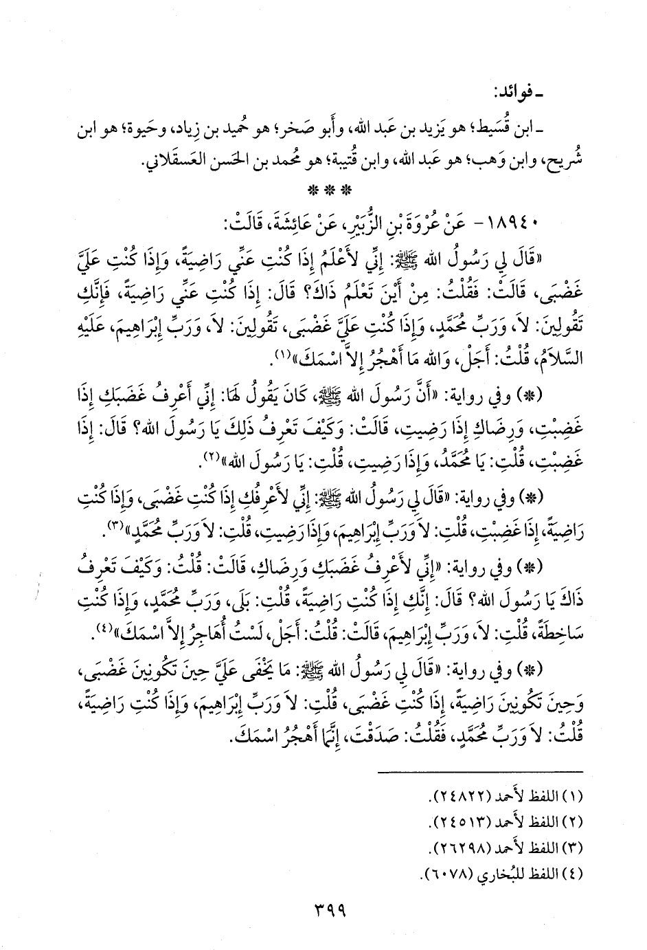 - وفي رواية: «إني لأعرف غضبك ورضاك، قالت: قلت: وكيف تعرف ذاك يا رسول الله؟ قال: إنك إذا كنت راضية، قلت: بلى، ورب محمد، وإذا كنت ساخطة، قلت: لا، ورب إبراهيم، قالت: قلت: أجل، لست أهاجر إلا اسمك» (¬٤).