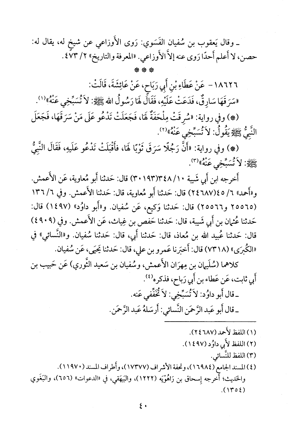 أخرجه ابن أبي شيبة (٣٠١٩٣) قال: حدثنا أَبو معاوية، عن الأعمش. و «أحمد» ٦/ ٤٥ (٢٤٦٨٧) قال: حدثنا أَبو معاوية, قال: حدثنا الأعمش. وفي ٦/ ١٣٦ (٢٥٥٦٥ و ٢٥٥٦٦) قال: حدثنا وكيع، عن سفيان. و «أَبو داود» (١٤٩٧) قال: حدثنا عثمان بن أبي شيبة, قال: حدثنا حفص بن غياث، عن الأعمش. وفي (٤٩٠٩) قال: حدثنا عُبيد الله بن معاذ, قال: حدثنا أبي, قال: حدثنا سفيان. و «النَّسَائي» في «الكبرى» (٧٣١٨) قال: أخبرنا عَمرو بن علي، قال: حدثنا يحيى، عن سفيان.