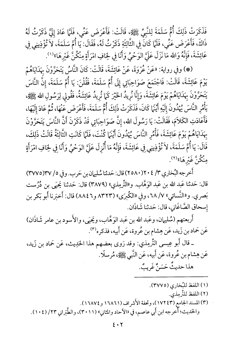 - قال التِّرمِذي: وقد روى بعضهم هذا الحديث، عن حماد بن زيد، عن هشام بن عروة، عن أبيه، عن النبي صَلى الله عَليه وسَلم مُرسلًا.