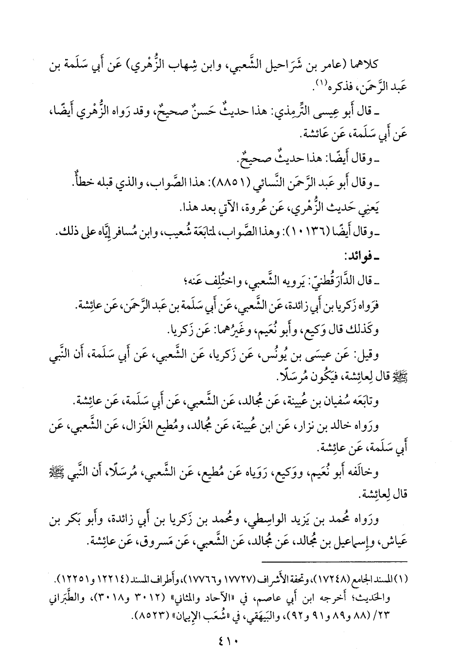 فرواه زكريا بن أبي زائدة، عن الشعبي، عن أبي سلمة بن عبد الرَّحمَن، عن عائشة.